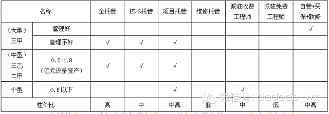 对于小医院来说,主要诉求是省钱。管理要求也不高,能把基本问题解决即可,于是选择“项目托管”或“派驻收费工程师”都可以。
